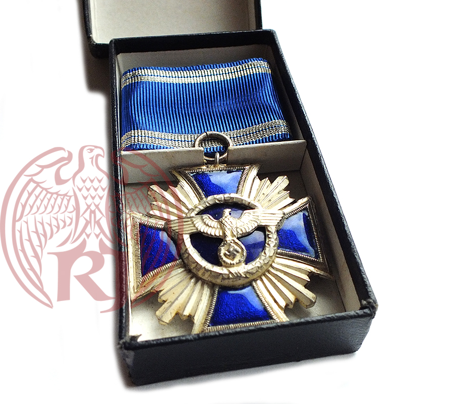 Gyönyörű, sötétkék tűzzománcozott felület, ezüstözött betűkkel és kerettel, eredeti teljes hosszúságú szalaggal, és a kimondottan ritka, gyönyörű állapotú adományozási dobozában. Gyártójel a dobozon: RZM M1/120. Gyártó: Wilhelm Deumer, Lüdenscheid