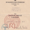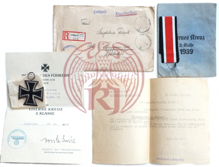 Die Kompanie übersendet Ihnen das Ihren gefallenen Sohn verliehene “Eiserne Kreut 2. Klasse” mit Besitzzeugnis. Leider konnte Ihr Sohn diese Auszeichnung nicht mehr selbst in Empfang nehmen. Mit den besten Wünschen für Ihr Wohlergehen und im Gedenken an unseren lieben Johann Frank grüsst Sie die Kompanie.”