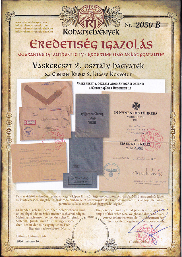 Érdekesség, hogy a Vaskereszt 2. osztály adományozási okirata 1944. december 27-én keltezett, amíg családnak legépelt levél keltezése 1945. február 21-én történt a csatatéren.