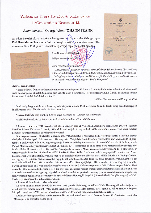A század elküldi Önnek az elesett fia tiszteletére adományozott Vaskereszt 2. osztály kitüntetést, valamint a kitüntetésről szóló adományozási okiratot. Sajnos fia nem vehette át ezt a kitüntetést. Jó egészséget kívánunk Önnek, és a kedves Johann Frank emlékére üdvözletét küldi a század.”